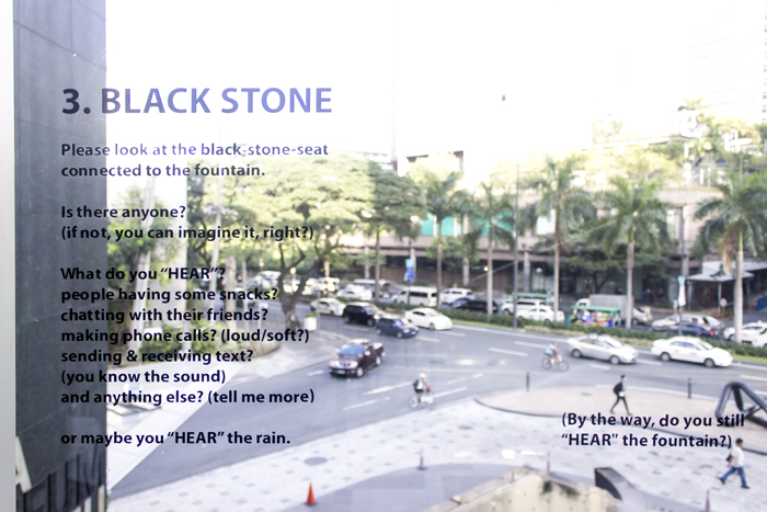 美術館の外に面した窓に以下のテキスト楽譜が記され、幾つかのオブジェがその周囲に設置された
