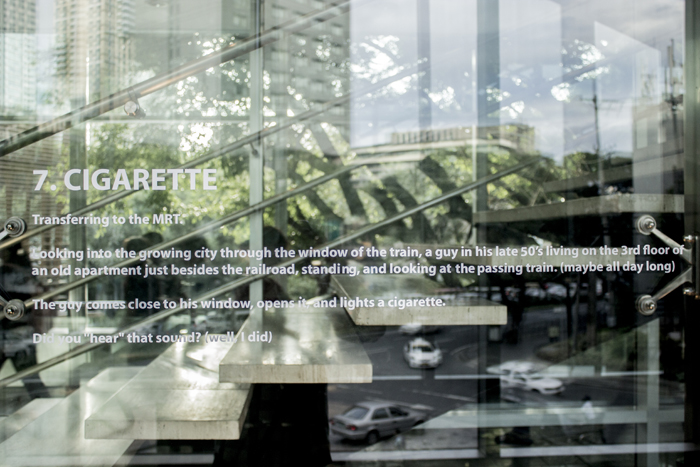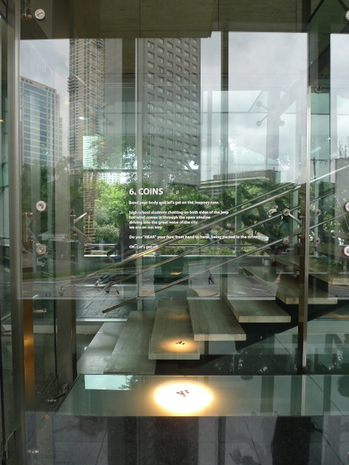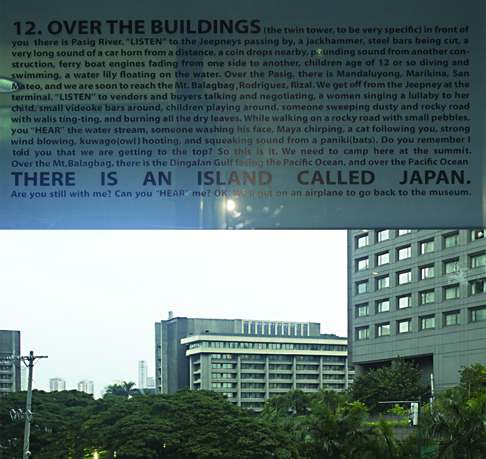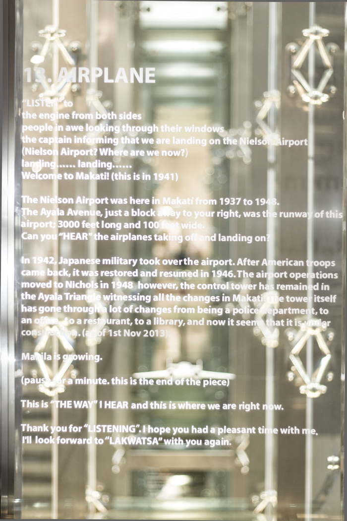 以下のテキストは展示空間におかれた2階建てサイズの巨大ガラスケースの表面、またはその空間の左右にあるガラス壁(片側は外に面し、逆側はたくさんの人が通り過ぎるショッピングモールの通路に面している)