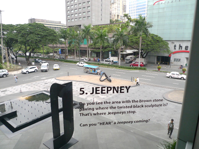 マカティの路地が見えるガラス窓に以下のテキスト楽譜が記された