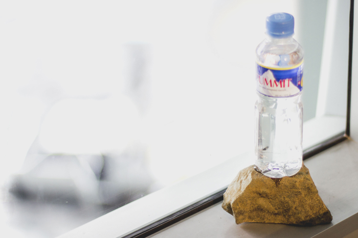 "350ml water bottle of "SUMMIT" on the rock taken from Mt.Balagbat, and a red "Coleman" tent besides"